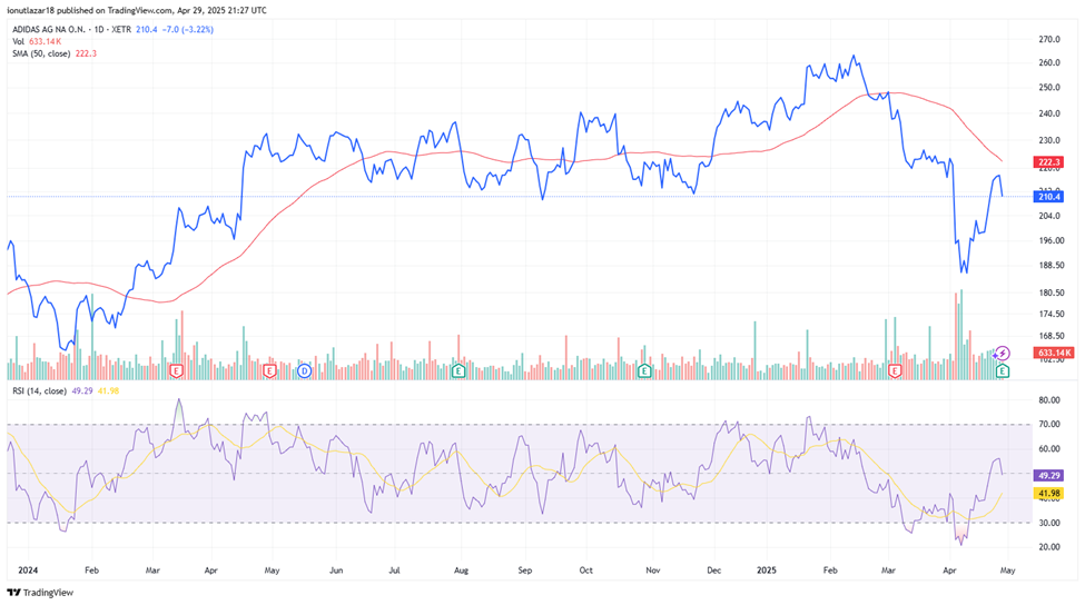 Although the reported results were viewed with great enthusiasm by the company’s management, investors were not so thrilled, with ADS shares seeing a decrease in their stock price on the day the quarterly report was published by over -3%. Also, the downward trend can be observed quite strongly since the beginning of this year, with the stock price of ADS shares decreasing by approximately -11%, still below the 50-day moving average since the beginning of March, amid global uncertainties caused by the imposition of Donald Trump’s trade tariffs.