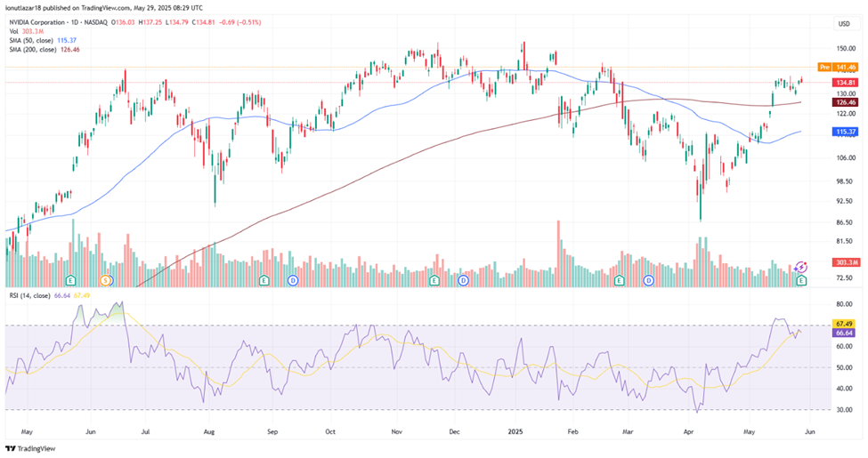 The release of the financial results triggered a strong positive reaction for NVDA stock, reflected in an upward movement of over +5% in the pre-market. From a technical point of view, the stock is overcoming a key resistance area and confirming the continuation of a consolidated uptrend, supported by positioning above the two important moving averages and a rising RSI. A firm close above $140 would validate the breakout, and in this context, the $145-$150 area may become the next target level, while the $130-$132 area would act as a verification support in case of consolidation.