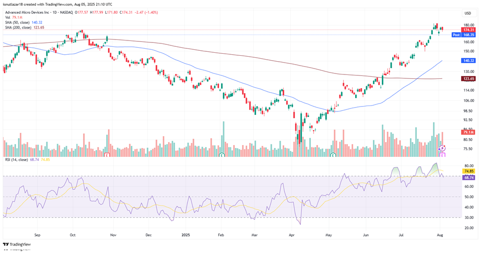 Advanced Micro Devices (AMD) has experienced a minor pullback following its strong multi-month rally that began in April. Just before releasing its Q2 2025 earnings, the stock dipped by -1.40%, and it extended losses by approximately -3.2% in the after-market, despite solid year-to-date performance. This slight correction comes amid profit-taking and short-term uncertainty, yet the broader trend remains firmly bullish, with AMD shares still up by an impressive +44.5% since the start of the year. While momentum indicators like RSI remain elevated, suggesting continued interest in the stock, near-term volatility could persist as investors digest the latest financial results and outlook.