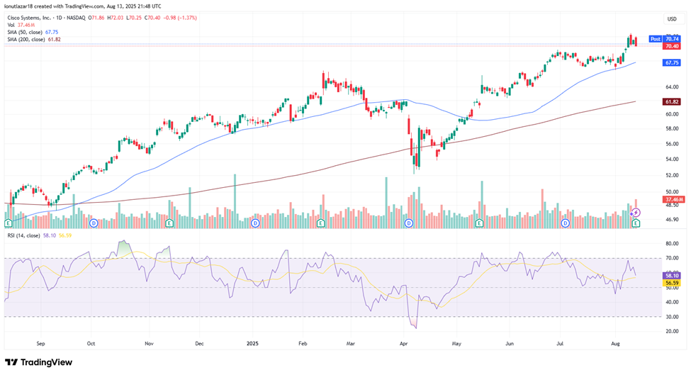 Ahead of its Q4 FY2025 earnings release, Cisco Systems’ stock saw a mild pullback, closing down approximately -1.4%. Post-results, the reaction was relatively muted, with shares edging up by about +0.5% despite the company delivering headline figures that exceeded Wall Street estimates. Technically, the price remains comfortably above both the 50-day SMA ($67.75) and the 200-day SMA ($61.82), reflecting an intact bullish structure. The RSI (14) stands at 58.10, still below overbought levels, suggesting room for further upside should buying momentum persist. Combined with the recent investor optimism, this could allow the stock to push toward new all-time highs. Year-to-date, Cisco shares are up nearly +19%, reinforcing the underlying positive trend.