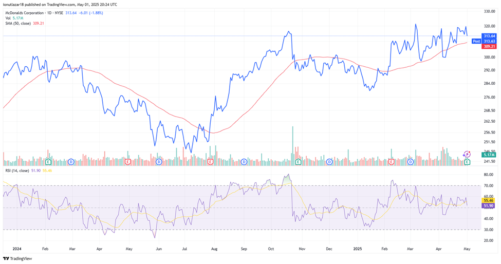 The quarterly results below analysts’ expectations were taxed by investors, with MCD’s share price decreasing by almost -2% after the market opened on May 1. However, since the beginning of this year, the stock price has managed to appreciate by over +7%, a pleasant surprise considering the global uncertainties caused by the imposition of trade tariffs, given that investors seem to have taken refuge by buying shares of this company, to the detriment of others that were intensely affected by President Donald Trump’s announcements.