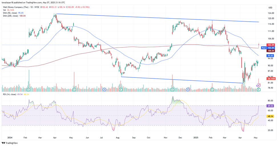 After the publication of the quarterly report, as well as after the confident statements of the company’s management regarding the opening of a new park in the Middle East, DIS shares had an excellent closing price on May 7, increasing by +10.76%. The reporting of financial results triggered a clearly bullish technical reaction for Disney shares. The simultaneous exceeding of the 50- and 200-day moving averages, along with the exit from the descending channel, suggests a possible trend change in favor of buyers. However, the RSI indicator signals a possible short-term overbought condition, which requires caution in waiting for confirmation by maintaining above the $100 threshold in the next trading sessions. Since the beginning of this year, the stock price of the shares is still in a significant decline, by approximately -8.3%, which confirms a possible overreaction of investors immediately after the good news brought by the company to the market.