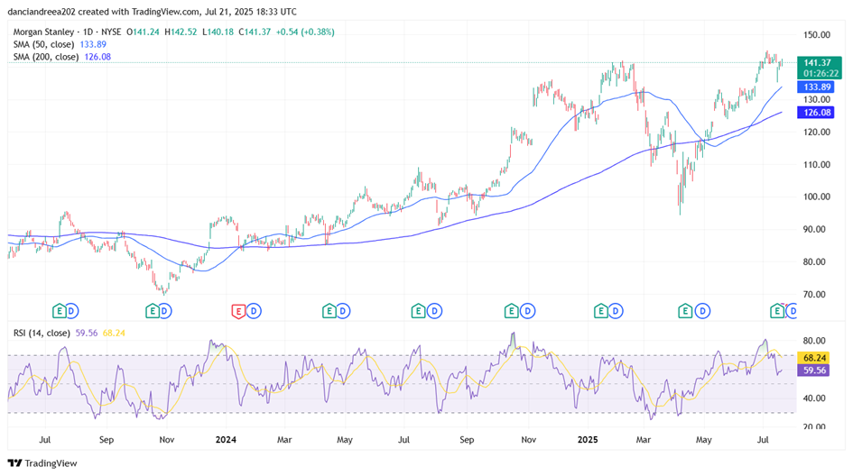 Morgan Stanley experienced a modest decline of around 2% in the five trading sessions following its Q2 2025 earnings release. Despite the initial downward pressure, the stock has shown signs of stabilization and remains above key technical levels, including the 50-day SMA and the 200-day SMA. The RSI has cooled to 59.56, retreating from overbought levels reached earlier in July, which may reflect a consolidation phase after a strong prior uptrend. While momentum has softened, the overall structure remains bullish, and the recovery from the post-earnings low near $136 suggests that buyers are stepping back in. As long as MS holds above the $138-$140 range, the technical outlook remains constructive, with potential for a renewed push toward recent highs around $143-$144.