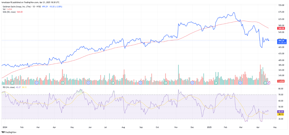 Even though the main results reported for the first quarter of 2025 were among the best in the company’s history, GS’s share price has fallen by about -2% since the announcement, experiencing quite high volatility, which has already become a habit for this period. Moreover, since the beginning of this year, the stock price has fallen by more than -13%, and since the beginning of March, it has been below the 50-day moving average, another clear signal that investors do not have very optimistic feelings about the future of the American market in general.