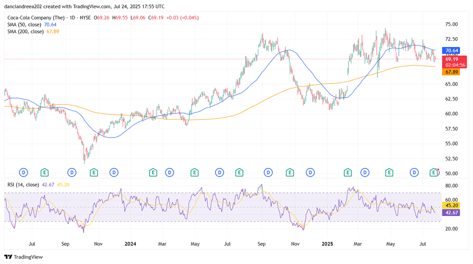 Following the release of its Q2 2025 earnings, Coca-Cola’s stock price has seen limited momentum, consolidating just below the 50-day simple moving average. Meanwhile, the 200-day SMA, a key long-term support indicator, holds around $67.89, offering a cushion for the stock amid recent softness. The RSI is currently at 42.67, signaling weak bullish momentum and approaching oversold territory (30). This suggests that while there is no strong selling pressure, buyers remain cautious, possibly awaiting further macro clarity or upward catalysts. From a trend perspective, the stock has failed to reclaim its highs from earlier in the year and remains locked in a short-term downtrend, having formed lower highs since May. If price action breaks convincingly below the 200-day SMA, the next support may lie near the psychological $65 level. On the upside, a close above $71-72 could suggest a potential reversal and re-entry into bullish territory. So, Coca-Cola is trading in a tight range with a mildly bearish bias in the short term. Investors will likely watch for confirmation signals around its key moving averages and broader market sentiment before making decisive moves.