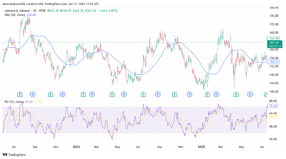 Technically, Johnson & Johnson (JNJ) is currently showing signs of moderate bullish momentum. Following the release of quarterly results, the stock was trading above its 50-day simple moving average, which could suggest an improvement in investor sentiment and a potential trend reversal. At the time of our analysis, the RSI was at 72.36, approaching overbought territory, indicating that the stock could face near-term resistance. However, this level also reflects increasing buying interest. Given the stock’s historical pattern of sideways movement and setbacks over the past year, a sustained move above the recent high near $168 could serve as a key signal for further upside.