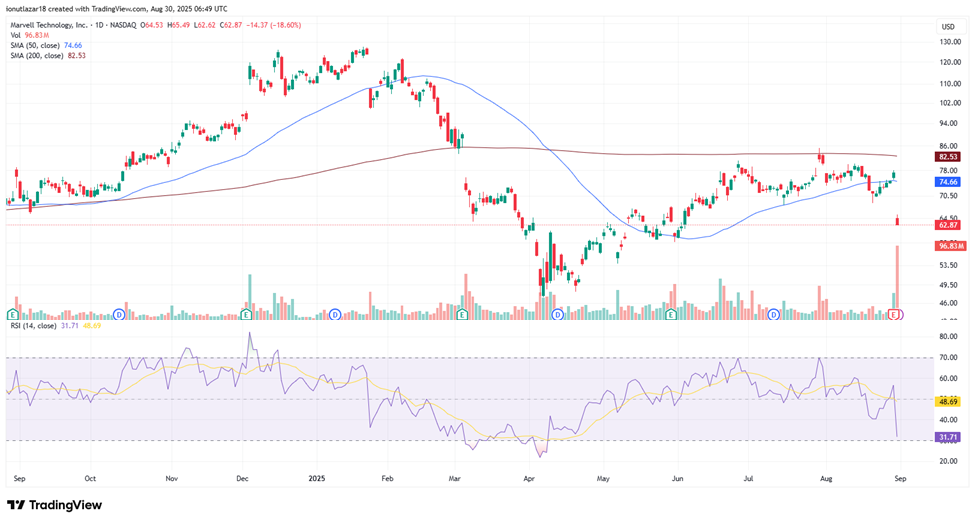 Marvell shares collapsed by -18.6% following its latest earnings release, as the company reported record revenues but still fell short of Wall Street expectations on both earnings and forward guidance. The disappointing outlook amplified selling pressure, driving the stock sharply below the 50-day SMA ($74.66) after a brief recent recovery. Technically, the RSI has plunged to 31.71, approaching oversold territory, which may trigger some short-term stabilization, though sentiment remains heavily bearish. Year-to-date, the stock is now down about -45%, reflecting persistent underperformance and raising concerns among investors about the company’s ability to deliver consistent growth in the current environment.