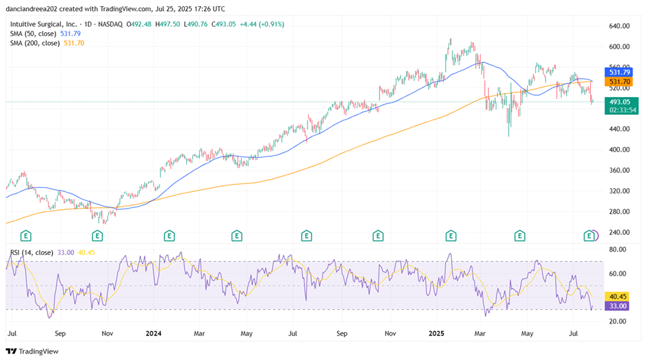 ISRG stock is currently trading below both its 50-day and 200-day moving averages, signaling a bearish technical setup in the short to medium term. The crossover of the 50-day SMA beneath the 200-day SMA (a “death cross”) suggests continued downside pressure. The RSI (14) is at 33.00, approaching oversold territory, which could indicate a potential short-term bounce or consolidation if buying interest emerges. Overall, the stock is under pressure and would need to reclaim the $530 level to regain technical strength. Until then, sentiment remains cautious.