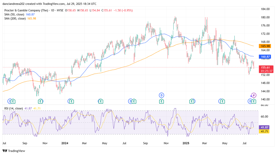 P&G is trading down 0.95%, and remains below both the 50-day SMA and 200-day SMA, signaling a bearish short- to medium-term trend. The RSI (14) is at 41.87, near the lower end of the neutral range, indicating weak momentum but not yet oversold. Immediate support is around $152-$153, with resistance near $161, the 50-day SMA. A breakout above $161 would signal a potential short-term reversal, while a drop below $152 could extend the downtrend.