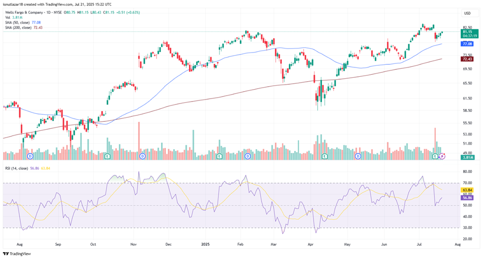 Following a brief decline triggered by its recent earnings release, Wells Fargo has shown signs of stabilization and recovery. Despite the initial drop, the stock has remained above both the 50-day SMA and the 200-day SMA, preserving its medium-term bullish structure. The RSI has rebounded to 59.66, up from earlier weakness, indicating renewed buying interest. This bounce suggests that the sell-off was likely a short-term reaction rather than a shift in trend. As long as WFC holds above the $77-$78 support zone, the setup remains constructive, with potential for a retest of the recent highs near $82-$83 if broader market conditions remain favorable.