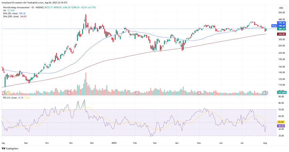 For MicroStrategy (MSTR), the stock saw a mild decline after earnings but strongly rebounded on the first trading day of this week, closing +6.17%, although it remains down roughly -4% over the last five days. Year-to-date, shares are still up nearly 30%, despite the high volatility driven by Bitcoin’s price swings given the company’s large BTC exposure. Technically, the stock trades just below its 50-day SMA ($395.36) and above the 200-day SMA ($344.83), suggesting a consolidation phase between these levels. The RSI (14) at ~45 indicates a recovery from oversold territory, though the stock hasn’t fully regained bullish momentum. The strong bounce on higher volume reflects renewed buyer interest, but short-term direction will depend heavily on Bitcoin’s stability and overall market sentiment.