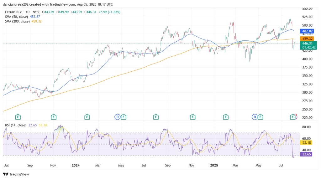 Ferrari’s stock showed a short-term rebound after recent declines. The share price remains below both the 50-day SMA ($482.87) and 200-day SMA ($459.32), reflecting a bearish trend that will require a recovery above the 200-day SMA to signal potential reversal. The RSI (14) at 32.65 indicates the stock is approaching oversold territory, suggesting possible short-term buying interest, though recent weakness above the 50 RSI level highlights fragile momentum. Key support lies around $425, with resistance near $460-$475. A break above $475 could restore bullish sentiment, while a fall below $425 may open the door to further downside.