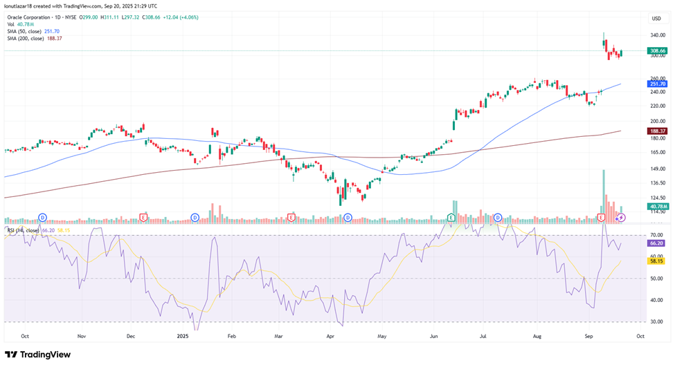 Oracle shares skyrocketed nearly +36% in a single session following the latest earnings release, fueled by strong results and renewed investor enthusiasm around AI. As expected, the move was followed by a mild correction in subsequent trading sessions, a normal reaction after such an extreme rally. Even so, the stock remains close to all-time highs, consolidating gains at elevated levels. The RSI stands at 66.20, still in overbought territory, which could bring short-term volatility, but the medium-term outlook remains strongly bullish. The 50-day SMA ($251.70), recently broken to the upside, is now likely to act as a key support level in the weeks ahead, reinforcing the positive technical setup.