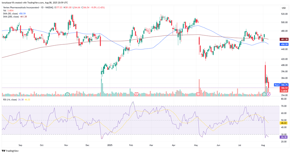 Vertex Pharmaceuticals (VRTX) experienced a dramatic -20.6% drop immediately after its earnings release, marking one of its steepest single-day declines in recent memory. While the downward momentum persisted, the pace of the sell-off eased slightly toward the end of the trading week, yet the stock still posted a sharp -21% loss over the past five sessions. Year-to-date, after a partial recovery earlier in the year, particularly following the post-earnings drop in May, the stock has now slid to fresh 52-week lows, breaking decisively below both its 50-day ($450.99) and 200-day ($461.38) moving averages. The RSI at 26.38 signals deeply oversold conditions, which could potentially lead to a short-term technical rebound, though the broader trend remains firmly bearish unless the price can reclaim key resistance levels.