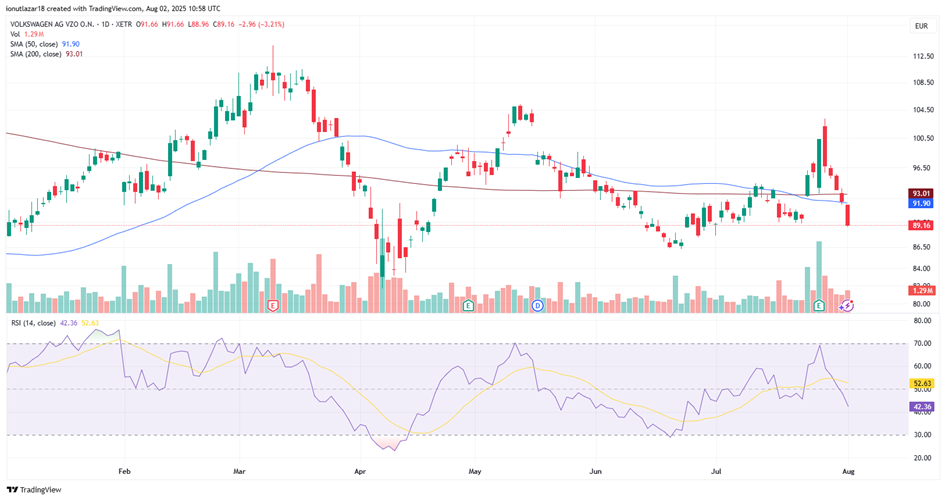 Volkswagen shares initially reacted positively after the Q2 2025 earnings release on July 25, but momentum quickly reversed. Over the past five trading days, the stock has dropped by -12.76%. On the daily chart, the price broke below key support levels and is now trading under both the 50-day SMA and 200-day SMA, signaling strong selling pressure. The elevated trading volume in recent sessions reflects significant distribution and a bearish short-term sentiment. The RSI (14) has fallen to 42.56, approaching oversold territory, which could indicate a potential short-term stabilization if buyers step in around the €88-€89 support zone. A failure to hold this level might extend the correction toward €85. For a recovery and a return to a bullish bias, the stock would need to reclaim €92-€93 and establish support above the moving averages.